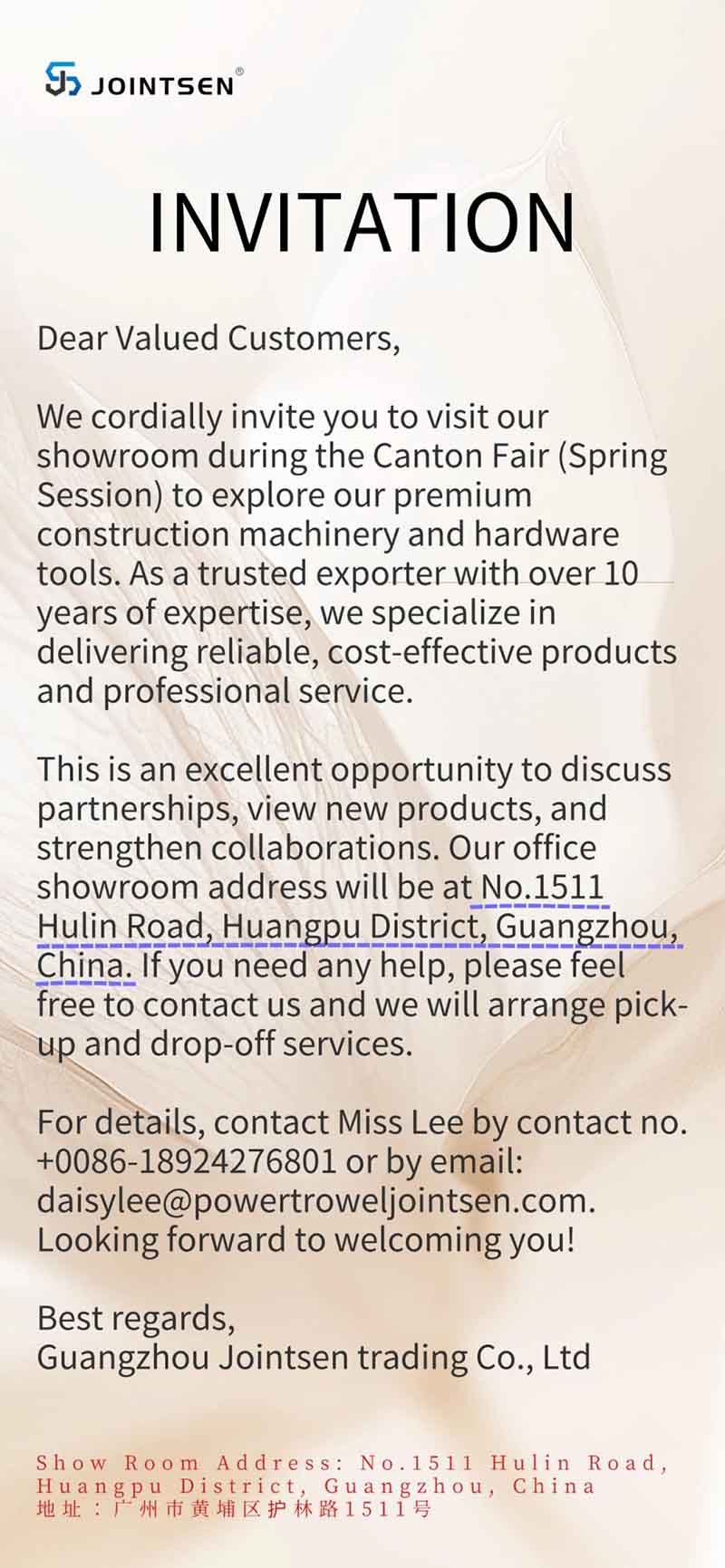 สำหรับรายละเอียดโปรดติดต่อ Miss Lee โดยไม่ต้องติดต่อ +0086-18924276801 หรือทางอีเมล: daisylee@powertroweljointsen.com รอคอยที่จะต้อนรับคุณ!
